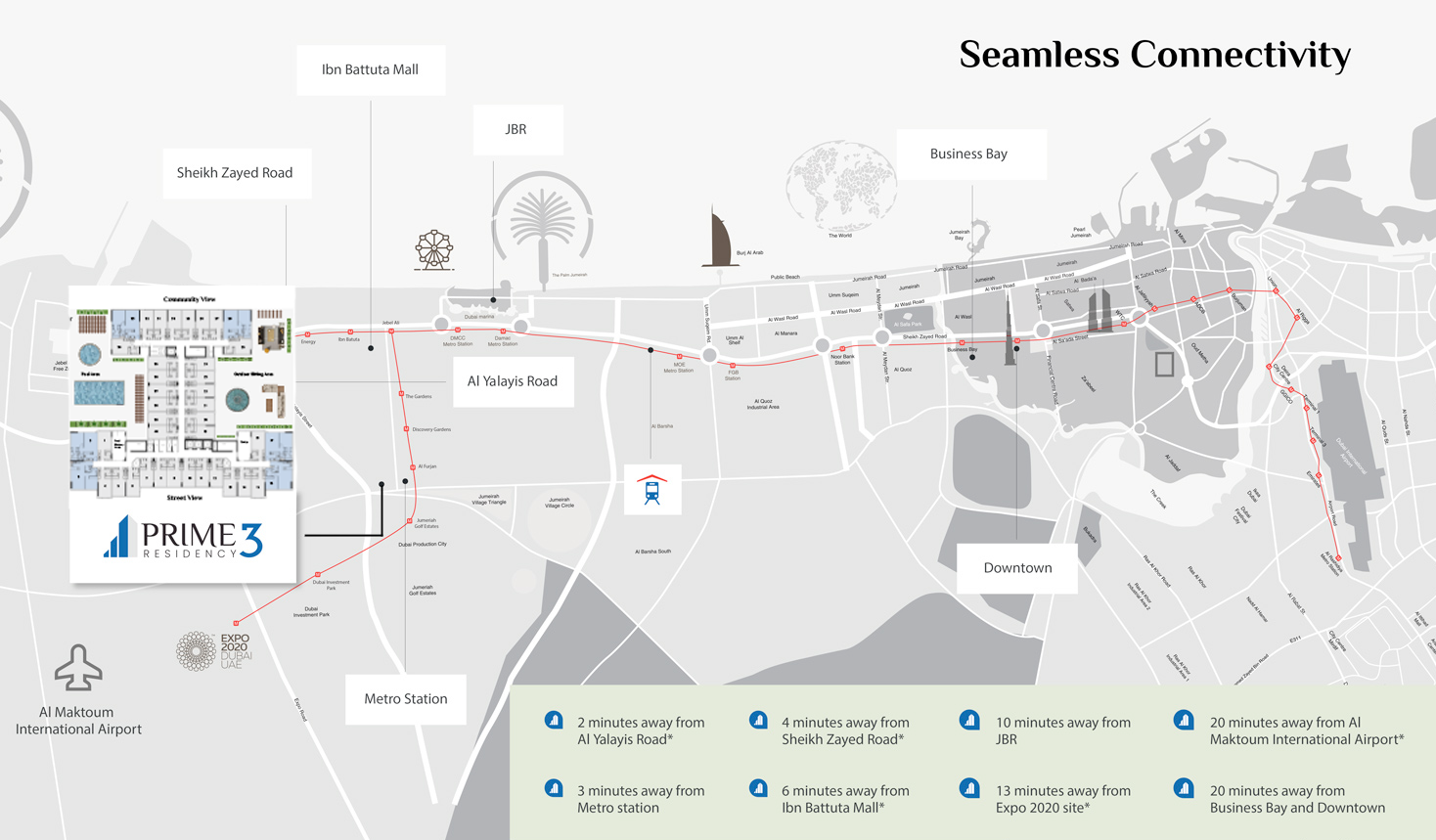 Prime Residences are strategically located with strong access links to the Dubai Expo 202, Dubai Al Maktoum International Airport and JAFZA.